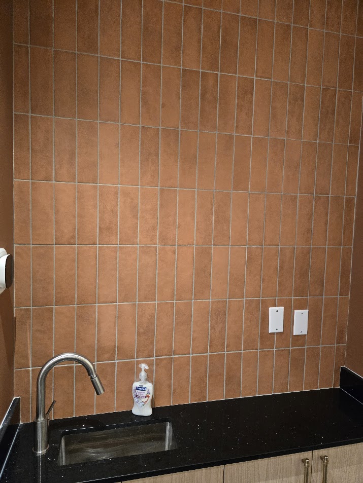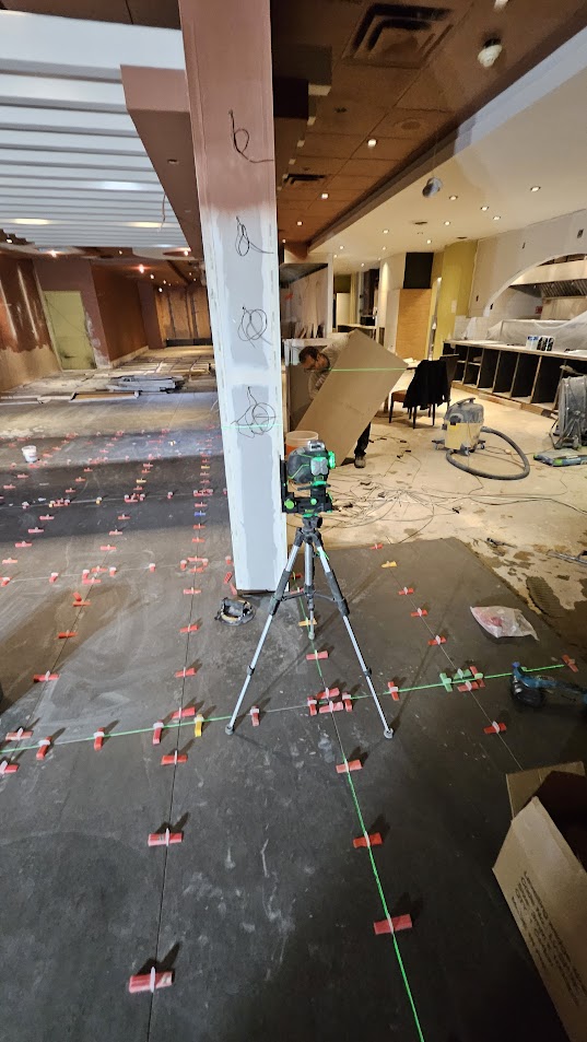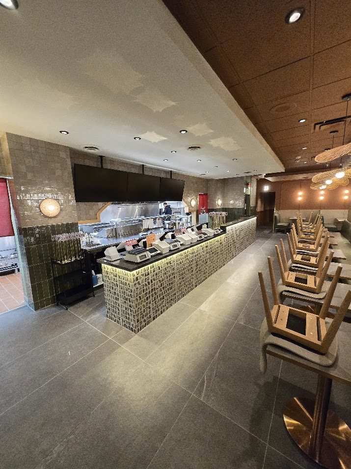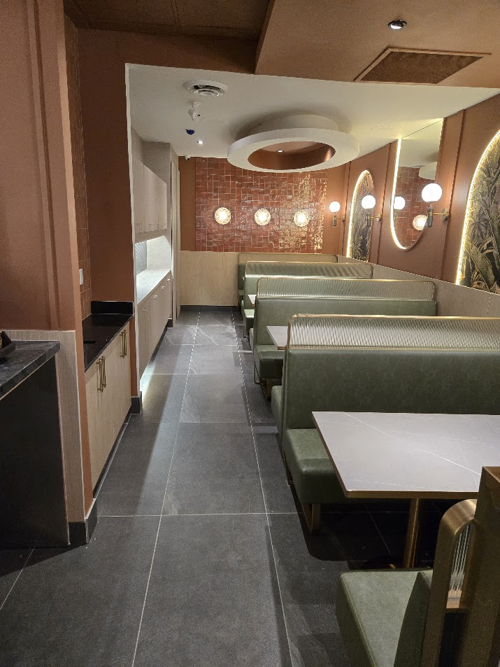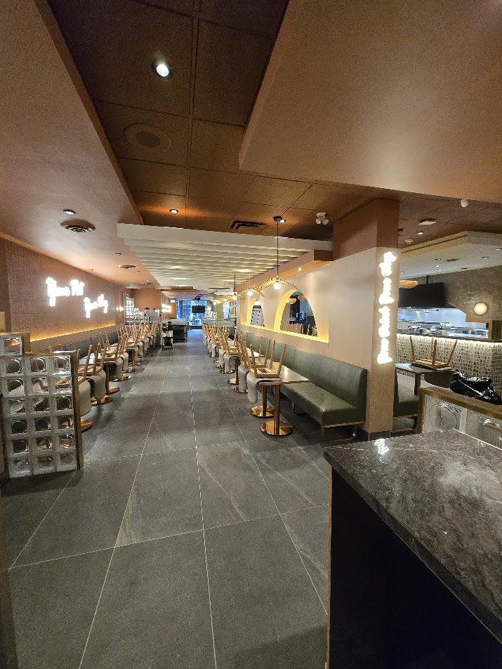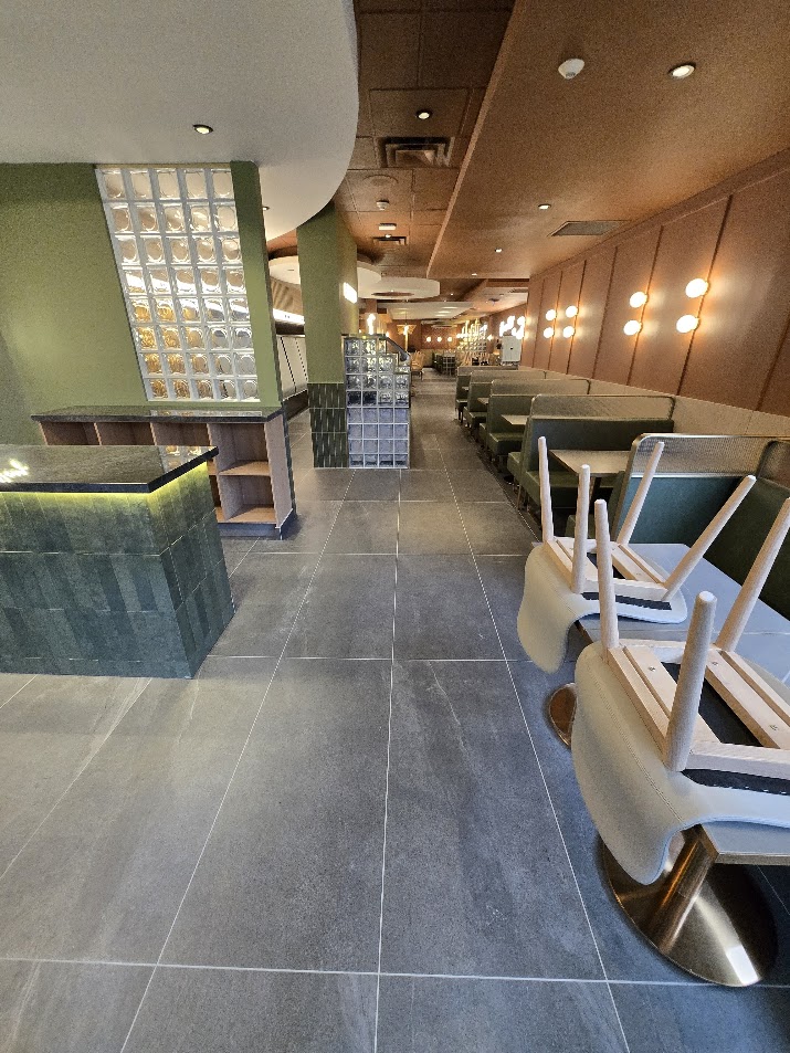 • Expansive Flooring: We installed 24×48 large format floor tiles across the main dining areas. These oversized tiles minimize grout lines, creating a sleek, modern, and expansive feel throughout the restaurant.