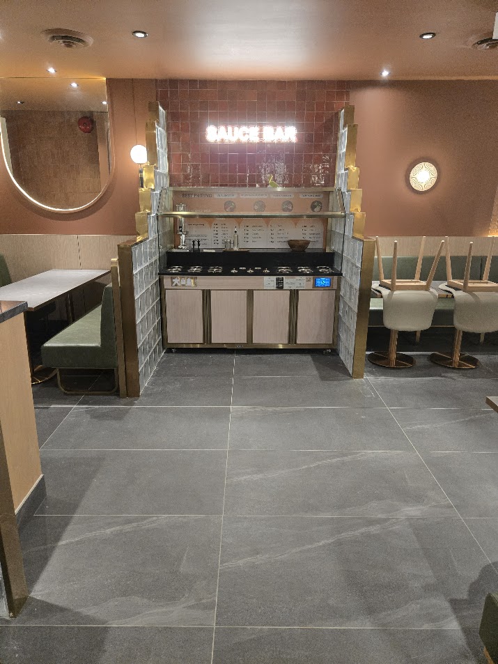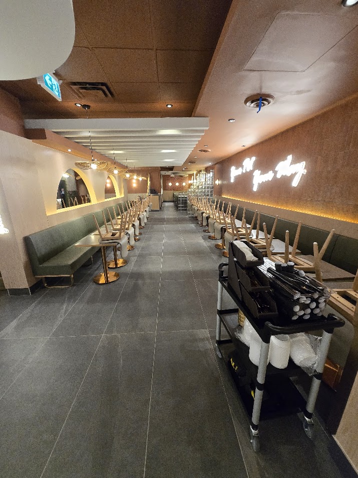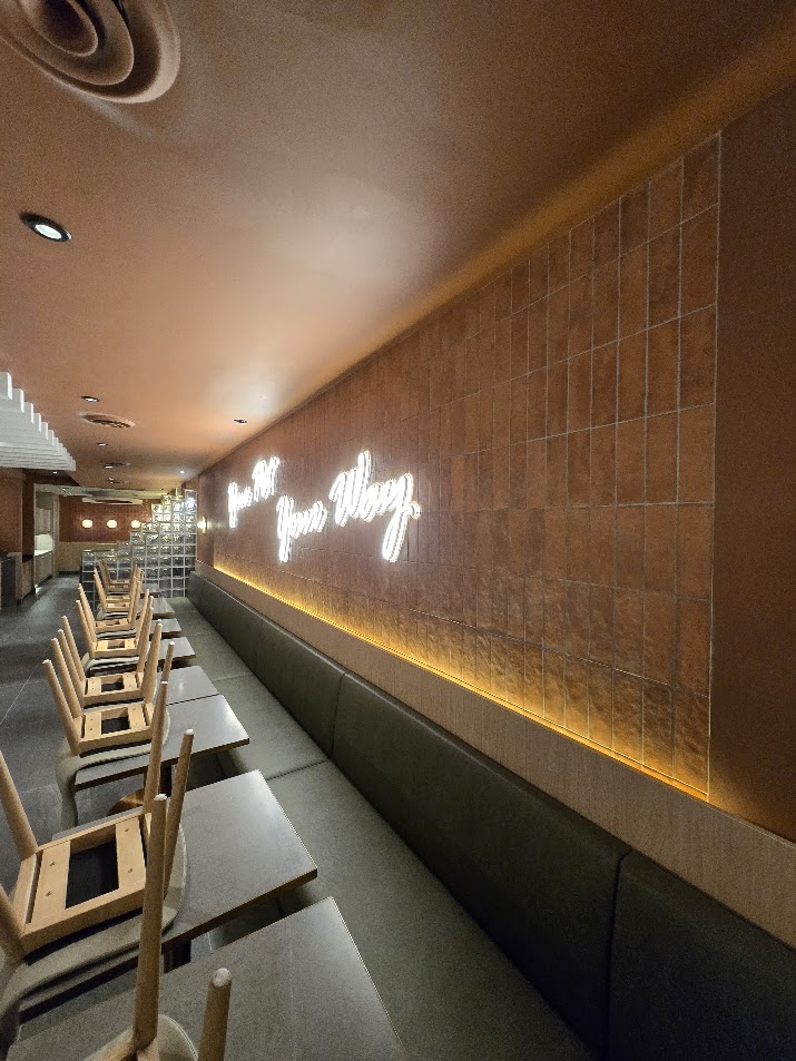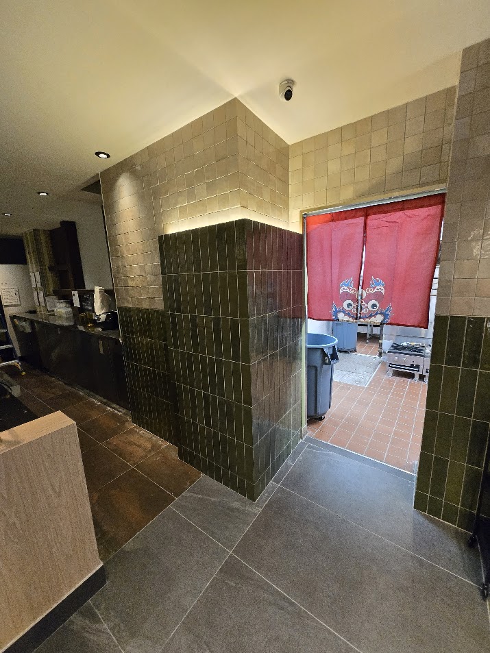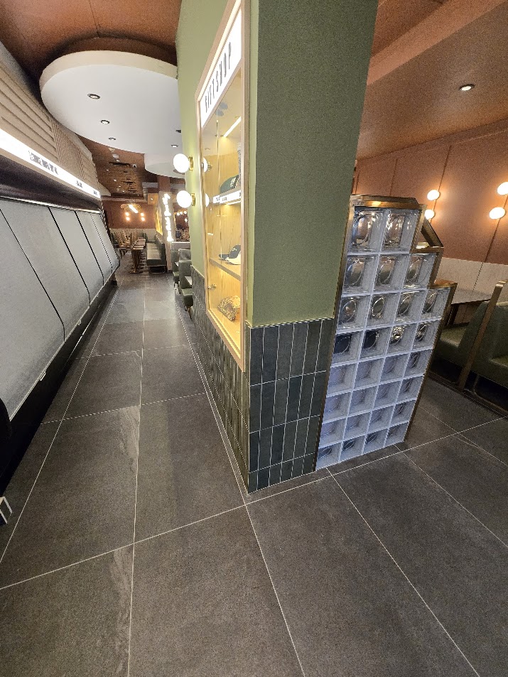 As seen in the final results, the combination of intricate wall patterns, neon signage backdrops, and massive floor slabs creates a truly fancy atmosphere. This project at Lonsdale demonstrates our ability to execute complex, high-detail tile designs that support the brand identity of a top-tier restaurant.