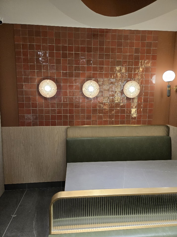 The foundation of the restaurant’s aesthetic is built on a seamless blend of various tile sizes and styles: